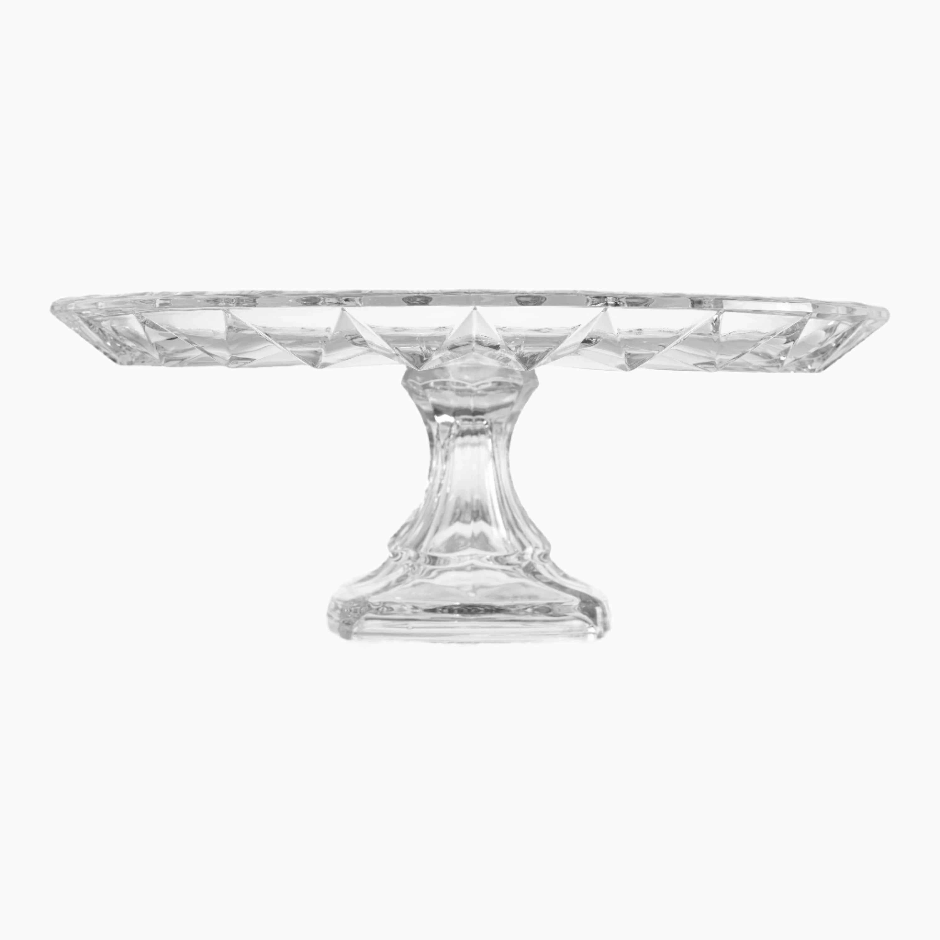 This product features elegant and functional transparent glass cake and dessert stands with intricate patterned details. Each stand showcases a round top plate with a prominent starburst or radial pattern and a central, patterned pedestal base. With a 12.5-inch diameter and a height of 4.5 inches, these stands are ideal for commercially displaying various cakes, cupcakes, pastries, desserts, and fruits in bakeries, cafes, hotels, catering events, and retail showrooms across Canada. The transparent design and embossed patterns add a luxurious touch to your presented items and integrate seamlessly with diverse decor styles. These stands are supplied in 4-piece mastercases.